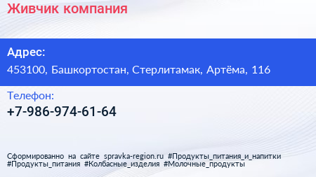 Живчик, компания по адресу 453100, Башкортостан, Стерлитамак, Артёма, 116 в дальнейшем Организация, размещена в следующих категориях: