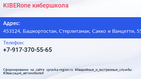 KIBERone, кибершкола по адресу 453124, Башкортостан, Стерлитамак, Сакко и Ванцетти, 55 в дальнейшем Организация, размещена в следующих категориях: