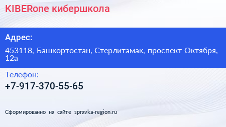 KIBERone, кибершкола по адресу 453118, Башкортостан, Стерлитамак, проспект Октября, 12а в дальнейшем Организация, размещена в следующих категориях: