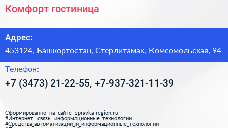 Комфорт, гостиница по адресу 453124, Башкортостан, Стерлитамак, Комсомольская, 94 в дальнейшем Организация, размещена в следующих категориях:
