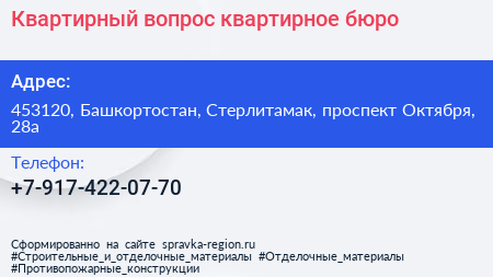 Квартирный вопрос, квартирное бюро по адресу 453120, Башкортостан, Стерлитамак, проспект Октября, 28а в дальнейшем Организация, размещена в следующих категориях:
