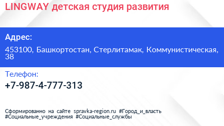 LINGWAY, детская студия развития по адресу 453100, Башкортостан, Стерлитамак, Коммунистическая, 38 в дальнейшем Организация, размещена в следующих категориях:
