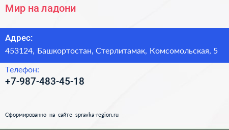 Мир на ладони по адресу 453124, Башкортостан, Стерлитамак, Комсомольская, 5 в дальнейшем Организация, размещена в следующих категориях: