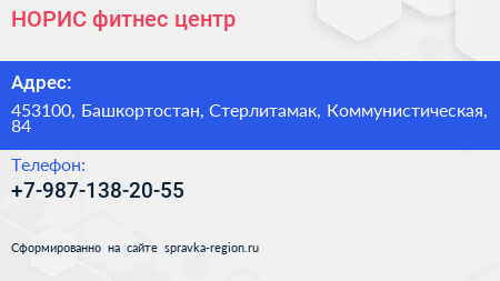 НОРИС, фитнес-центр по адресу 453100, Башкортостан, Стерлитамак, Коммунистическая, 84 в дальнейшем Организация, размещена в следующих категориях:
