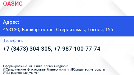 ОАЗИС по адресу 453130, Башкортостан, Стерлитамак, Гоголя, 155 в дальнейшем Организация, размещена в следующих категориях: