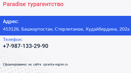 Paradise, турагентcтво по адресу 453128, Башкортостан, Стерлитамак, Худайбердина, 202а в дальнейшем Организация, размещена в следующих категориях:
