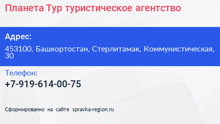 Планета-Тур, туристическое агентство по адресу 453100, Башкортостан, Стерлитамак, Коммунистическая, 30 в дальнейшем Организация, размещена в следующих категориях: