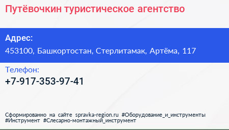 Путёвочкин, туристическое агентство по адресу 453100, Башкортостан, Стерлитамак, Артёма, 117 в дальнейшем Организация, размещена в следующих категориях: