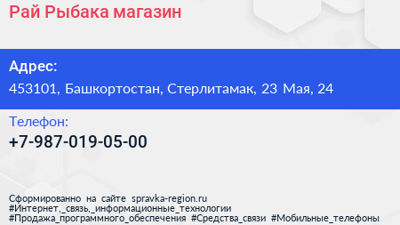 Рай Рыбака, магазин по адресу 453101, Башкортостан, Стерлитамак, 23 Мая, 24 в дальнейшем Организация, размещена в следующих категориях: