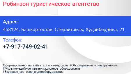 Робинзон, туристическое агентство по адресу 453124, Башкортостан, Стерлитамак, Худайбердина, 21 в дальнейшем Организация, размещена в следующих категориях: