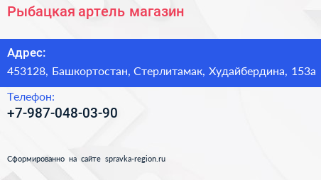 Рыбацкая артель, магазин по адресу 453128, Башкортостан, Стерлитамак, Худайбердина, 153а в дальнейшем Организация, размещена в следующих категориях: