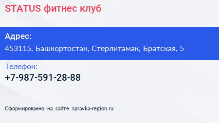 STATUS, фитнес-клуб по адресу 453115, Башкортостан, Стерлитамак, Братская, 5 в дальнейшем Организация, размещена в следующих категориях: