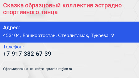 Сказка, образцовый коллектив эстрадно-спортивного танца по адресу 453104, Башкортостан, Стерлитамак, Тукаева, 9 в дальнейшем Организация, размещена в следующих категориях: