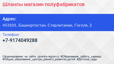 Шланлы, магазин полуфабрикатов по адресу 453101, Башкортостан, Стерлитамак, Гоголя, 2 в дальнейшем Организация, размещена в следующих категориях: