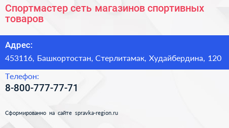 Спортмастер, сеть магазинов спортивных товаров по адресу 453116, Башкортостан, Стерлитамак, Худайбердина, 120 в дальнейшем Организация, размещена в следующих категориях: