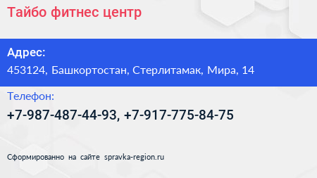 Тайбо, фитнес-центр по адресу 453124, Башкортостан, Стерлитамак, Мира, 14 в дальнейшем Организация, размещена в следующих категориях:
