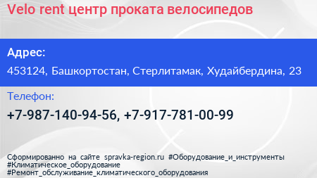 Velo rent, центр проката велосипедов по адресу 453124, Башкортостан, Стерлитамак, Худайбердина, 23 в дальнейшем Организация, размещена в следующих категориях: