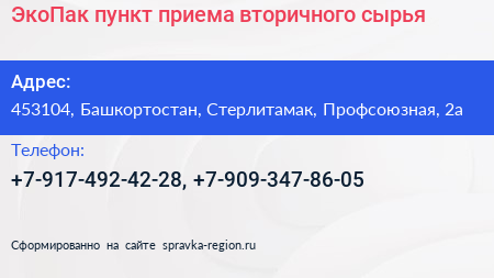 ЭкоПак, пункт приема вторичного сырья по адресу 453104, Башкортостан, Стерлитамак, Профсоюзная, 2а в дальнейшем Организация, размещена в следующих категориях: