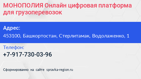 МОНОПОЛИЯ. Онлайн, цифровая платформа для грузоперевозок по адресу 453100, Башкортостан, Стерлитамак, Водолаженко, 1 в дальнейшем Организация, размещена в следующих категориях: