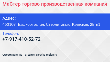 МаСтер, торгово-производственная компания по адресу 453109, Башкортостан, Стерлитамак, Раевская, 2Б к1 в дальнейшем Организация, размещена в следующих категориях: