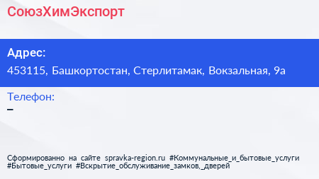 СоюзХимЭкспорт по адресу 453115, Башкортостан, Стерлитамак, Вокзальная, 9а в дальнейшем Организация, размещена в следующих категориях:
