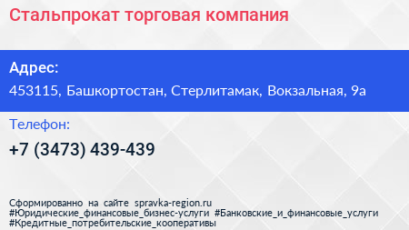 Стальпрокат, торговая компания по адресу 453115, Башкортостан, Стерлитамак, Вокзальная, 9а в дальнейшем Организация, размещена в следующих категориях: