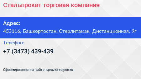 Стальпрокат, торговая компания по адресу 453116, Башкортостан, Стерлитамак, Дистанционная, 9г в дальнейшем Организация, размещена в следующих категориях: