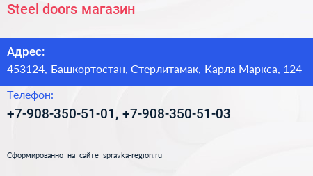 Steel doors, магазин по адресу 453124, Башкортостан, Стерлитамак, Карла Маркса, 124 в дальнейшем Организация, размещена в следующих категориях: