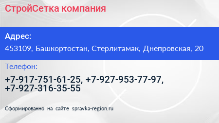 СтройСетка, компания по адресу 453109, Башкортостан, Стерлитамак, Днепровская, 20 в дальнейшем Организация, размещена в следующих категориях: