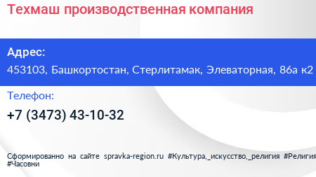 Техмаш, производственная компания по адресу 453103, Башкортостан, Стерлитамак, Элеваторная, 86а к2 в дальнейшем Организация, размещена в следующих категориях: