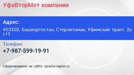 УфаВторМет, компания по адресу 453102, Башкортостан, Стерлитамак, Уфимский тракт, 2а ст1 в дальнейшем Организация, размещена в следующих категориях: