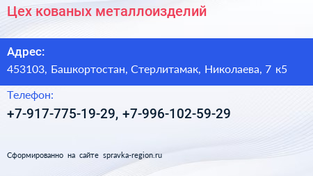 Цех кованых металлоизделий по адресу 453103, Башкортостан, Стерлитамак, Николаева, 7 к5 в дальнейшем Организация, размещена в следующих категориях: