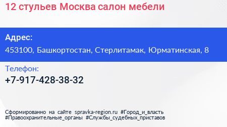 12 стульев-Москва, салон мебели по адресу 453100, Башкортостан, Стерлитамак, Юрматинская, 8 в дальнейшем Организация, размещена в следующих категориях: