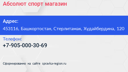 Абсолют спорт, магазин по адресу 453116, Башкортостан, Стерлитамак, Худайбердина, 120 в дальнейшем Организация, размещена в следующих категориях: