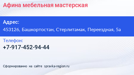 Афина, мебельная мастерская по адресу 453126, Башкортостан, Стерлитамак, Переездная, 5а в дальнейшем Организация, размещена в следующих категориях: