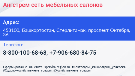 Ангстрем, сеть мебельных салонов по адресу 453100, Башкортостан, Стерлитамак, проспект Октября, 36 в дальнейшем Организация, размещена в следующих категориях: