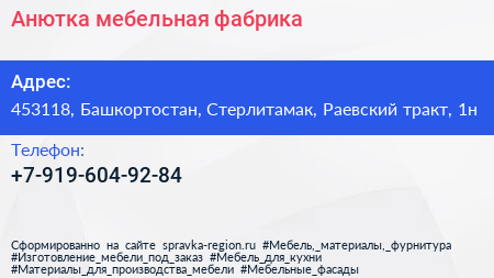 Анютка, мебельная фабрика по адресу 453118, Башкортостан, Стерлитамак, Раевский тракт, 1н в дальнейшем Организация, размещена в следующих категориях: