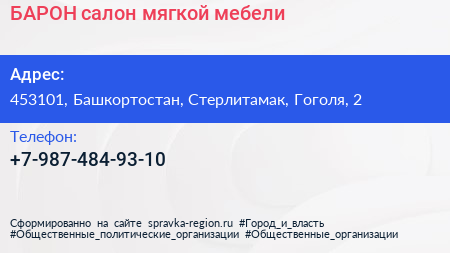 БАРОН, салон мягкой мебели по адресу 453101, Башкортостан, Стерлитамак, Гоголя, 2 в дальнейшем Организация, размещена в следующих категориях: