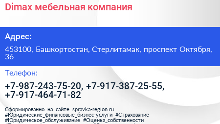 Dimax, мебельная компания по адресу 453100, Башкортостан, Стерлитамак, проспект Октября, 36 в дальнейшем Организация, размещена в следующих категориях: