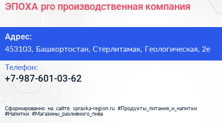 ЭПОХА pro, производственная компания по адресу 453103, Башкортостан, Стерлитамак, Геологическая, 2е в дальнейшем Организация, размещена в следующих категориях: