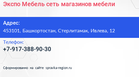 Экспо Мебель, сеть магазинов мебели по адресу 453101, Башкортостан, Стерлитамак, Ивлева, 12 в дальнейшем Организация, размещена в следующих категориях:
