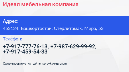 Идеал, мебельная компания по адресу 453124, Башкортостан, Стерлитамак, Мира, 53 в дальнейшем Организация, размещена в следующих категориях: