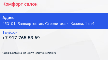 Комфорт, салон по адресу 453101, Башкортостан, Стерлитамак, Казина, 1 ст4 в дальнейшем Организация, размещена в следующих категориях: