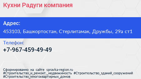Кухни Радуги, компания по адресу 453103, Башкортостан, Стерлитамак, Дружбы, 29а ст1 в дальнейшем Организация, размещена в следующих категориях: