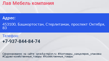 Лав Мебель, компания по адресу 453100, Башкортостан, Стерлитамак, проспект Октября, 83 в дальнейшем Организация, размещена в следующих категориях:
