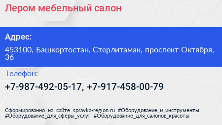 Лером, мебельный салон по адресу 453100, Башкортостан, Стерлитамак, проспект Октября, 36 в дальнейшем Организация, размещена в следующих категориях: