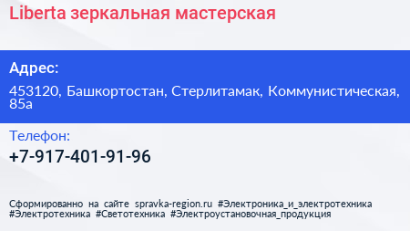 Liberta, зеркальная мастерская по адресу 453120, Башкортостан, Стерлитамак, Коммунистическая, 85а в дальнейшем Организация, размещена в следующих категориях: