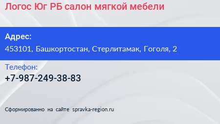Логос-Юг-РБ, салон мягкой мебели по адресу 453101, Башкортостан, Стерлитамак, Гоголя, 2 в дальнейшем Организация, размещена в следующих категориях:
