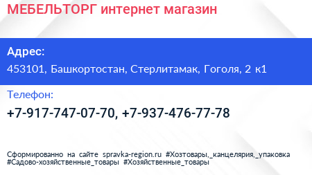 МЕБЕЛЬТОРГ, интернет-магазин по адресу 453101, Башкортостан, Стерлитамак, Гоголя, 2 к1 в дальнейшем Организация, размещена в следующих категориях: