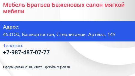 Мебель Братьев Баженовых, салон мягкой мебели по адресу 453100, Башкортостан, Стерлитамак, Артёма, 149 в дальнейшем Организация, размещена в следующих категориях: